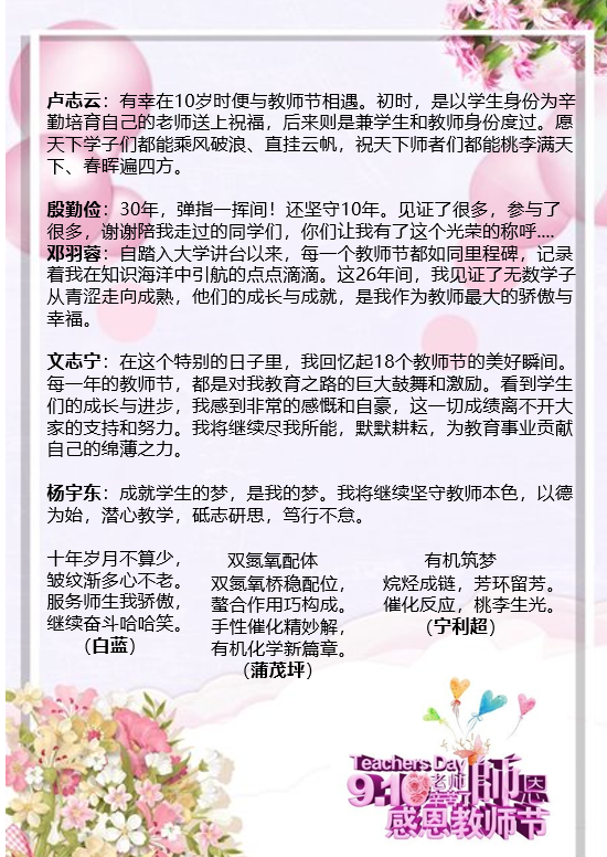 为大力弘扬教育家精神,加快建设教育强国,在第40个教师节来临之际,化学学院工会精心组织开展了“我和我的第N个教师节”活动。