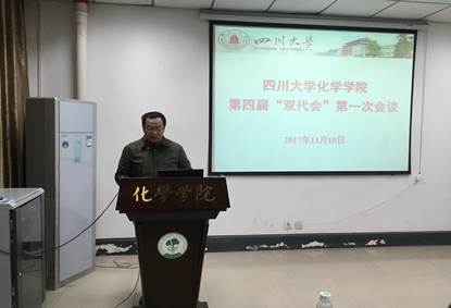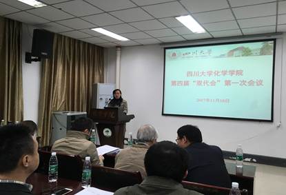 2017年11月10日,四川大学化学学院第四届教职工代表大会暨工会代表大会第一次会议在化学馆121会议室隆重召开。本次大会的主题是“传承百年文化底蕴,建设世界一流化学学科”。学校工会副主席冷泠、学院相关领导及53名双代会代表出席本次会议,原四川大学校长鄢国森教授、原化学学院党委书记肖有发等老领导特邀出席。大会由王智猛书记主持,大会执行主席由学院党委副书记谢均同志担任。