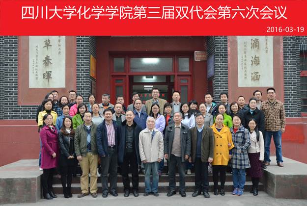 2016年3月19日,四川大学化学学院第三届教职工代表大会、工会代表大会第六次会议在化学馆121会议室隆重召开。学院相关领导及双代会代表出席本次会议,原四川大学校长鄢国森教授、原化学学院党委肖有发书记、科学发展研究院胡常伟院长等老领导特邀出席。