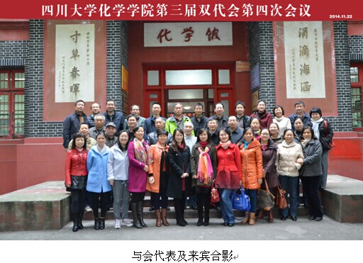 2014年11月22日,四川大学化学学院第三届教职工代表大会、工会代表大会第四次会议在化学馆121会议室隆重召开。学院相关领导及双代会代表出席本次会议,原四川大学校长鄢国森教授、原化学学院党委肖有发书记等老领导特邀出席。