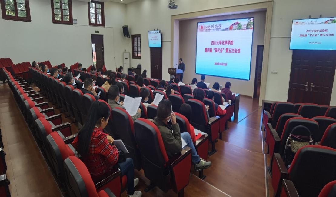 2021年10月22日,四川大学化学学院第四届教职工代表大会暨工会代表大会第五次会议在化学馆321报告厅隆重召开。学院领导班子及46名双代会代表出席本次会议,大会由党委书记谢均同志主持。本次大会的主题是:凝心聚力,争创一流,开启“十四五”新篇章。