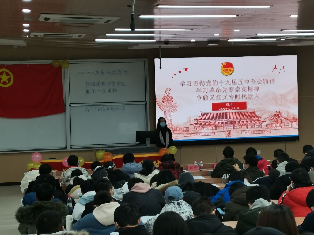 本届院级团校安排了四次授课。化学学院党委书记谢均老师、校团委副书记黄菲娅老师、化学学院团委书记来俏老师分别讲授了主题为“学习贯彻党的十九届五中全会精神,学习革命先辈的崇高精神,争做又红又专的时代新人”、“科创报国精神传承与大学生创新创业能力培养”、“光荣的中国共青团”主题团课,组织部、文体部联合举办了素质拓展活动暨趣味运动会。