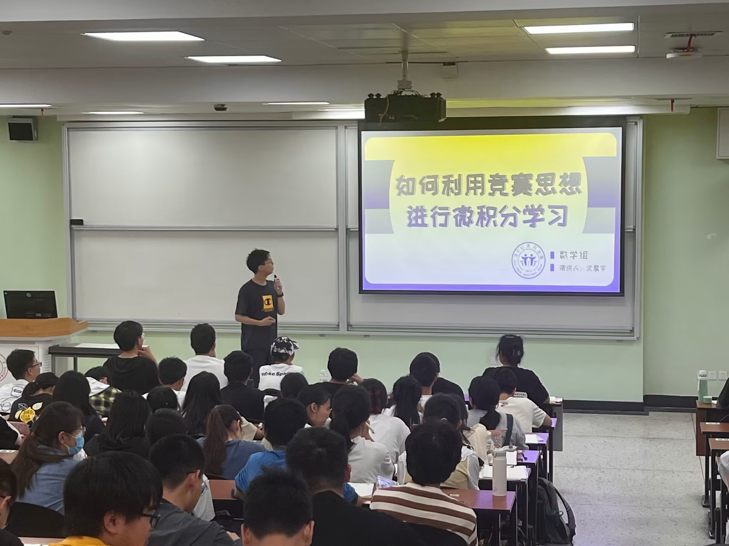 数学组的沈震宇同学为大家分享了“如何利用竞赛思想进行微积分学习”,引导同学们更有效、快速地学习微积分。沈震宇同学传授了以下三个方法:1.用知识框架思维导图加强自己记忆;2.学习练习更加综合、思维性更加强的题目;3.注意思维训练,加强交流与合作。沈震宇同学鼓励同学们以更加主动的心态学习微积分知识。