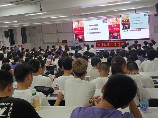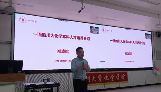 2023年9月11日,江安校区综合楼C107,化学学院副院长郑成斌教授为2023级本科新生开展主题为“一流的川大化学本科人才培养介绍”的入学教育讲座。本次讲座由党委副书记肖波主持,2023级辅导员及学院2023级全体本科新生参加。