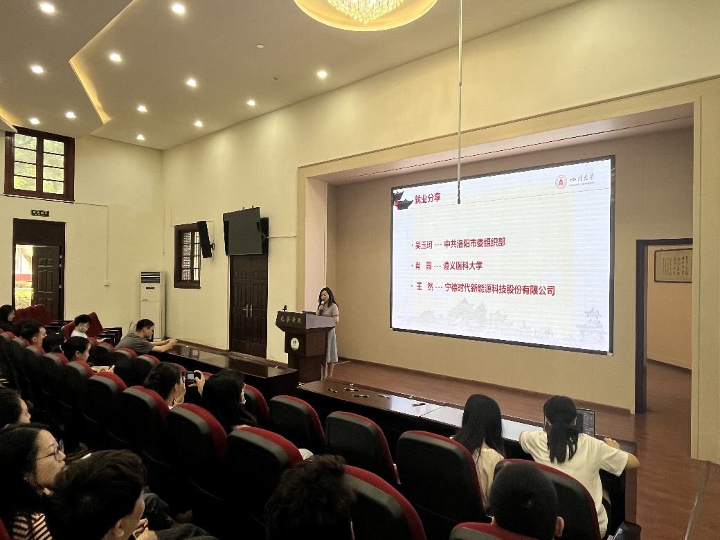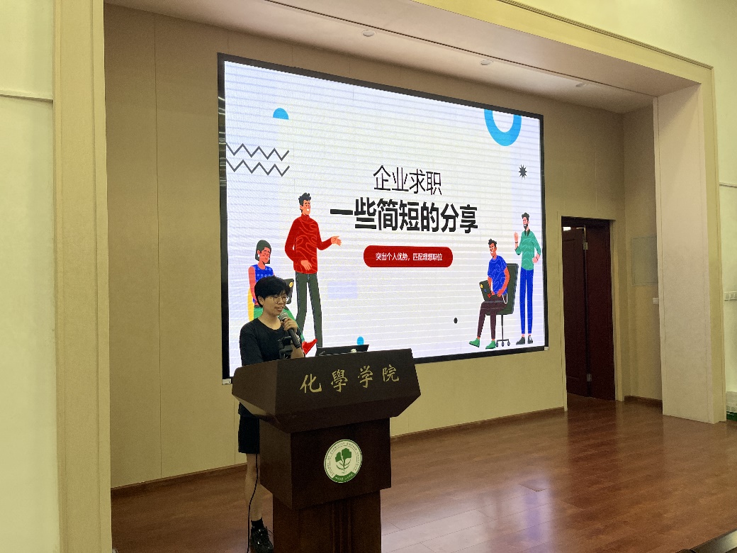 2024年5月31日上午, 化学学院举行2024届毕业研究生就业分享交流会,2022级研究生同学参加了此次交流会。杜晓燕老师简要介绍了近年来学院研究生的就业情况,请同学们合理调整心理预期,沉下心来认真思考,以正确的心态、全面的考量选择自己理想中的工作岗位。