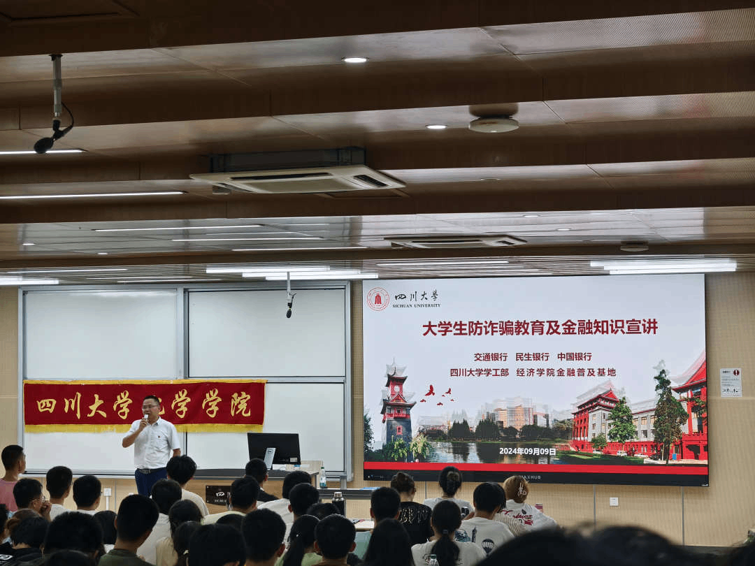 2024年9月9日,四川大学江安校区综合楼C207举行了一场别开生面的主题宣讲活动。本次活动由交通银行王红明主任主讲,旨在提高大学生防诈骗意识,树立正确的消费观,为化学学院2024级本科生带来了一场关于“大学生防诈骗教育及金融知识”的精彩讲座。化学学院2024级全体本科生及辅导员侯鹏飞老师参加了本次宣讲。