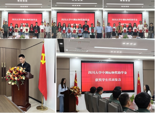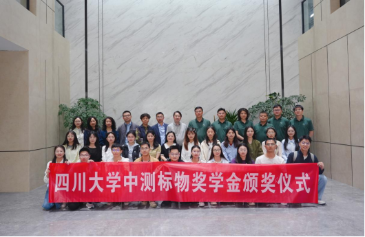 2025年4月28日下午,四川大学中测标物奖助学金签约仪式暨颁奖典礼在四川中测标物科技有限公司举行。四川大学化学学院院长、分析测试中心主任吕弋教授,分析测试中心党总支副书记谭新禹、邹琴副研究员,化学学院汪秀丽教授、学生科长杜晓燕、辅导员余青颖以及获奖同学参加了此次颁奖典礼。