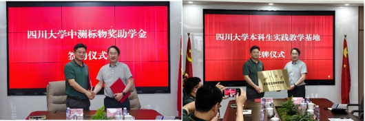 在全体见证下,吕弋与杨嘉伟进行四川大学中测标物奖助金捐赠签约,并为"四川大学本科生实践教学基地"揭牌。