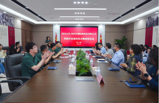 参观完毕,与会嘉宾与同学们齐聚公司会议室参加四川大学中测标物奖助学金签约仪式暨颁奖典礼。