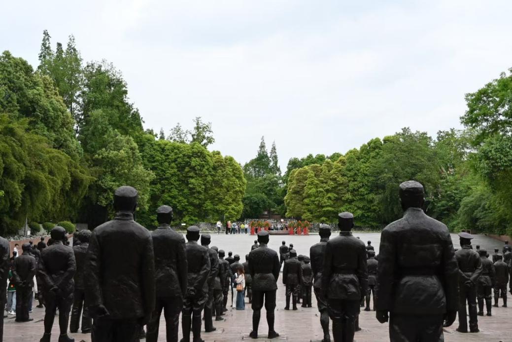 活动的最后一站是“中国壮士”群雕广场。广场上,200余尊抗战英雄雕像按抗日战争的战区战役关系分组,庄严矗立,每座雕像以人物原型1.2倍的比例放大设计,青铜铸造的肌理与深邃的目光传递着跨越时空的力量。党员们驻足凝视,英雄们的身姿与参观者的身影在阳光中交错,仿佛展开一场静默的对话。历史的风雷与时代的回响在此刻凝结,诠释着“山河犹在,国泰民安”的厚重承诺。