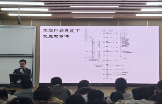 随后,杨成教授讲述了化学中不同的时间尺度。他先举例“滴沥青”“牛津电子钟”等长耗时实验,随后用形象的动画表现了粒子尺度的微化与时间尺度缩进的伴随关系,同时通过夸克未见先知的发现进程和电子的量子力学不确定性强调了化学中的发散思维。杨成教授强调了各观测规模与时间尺度的关系以及动力学范围与测量速率的对应。光化学发展的最大体现之一在于以更高的观测速率捕捉激发态分子的照片。最后,杨成教授介绍了化学与生物学在时间尺度上的探索与进步,电磁波与原子分子尺度的碰撞。