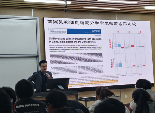 首先,杨成教授通过展示中美印俄四个国家大学生进入大学后数理能力和批判性思维变化的对比凸显了当代中国大学生批判性思维培养的缺乏,由此引出对化学中时间尺度的探索。