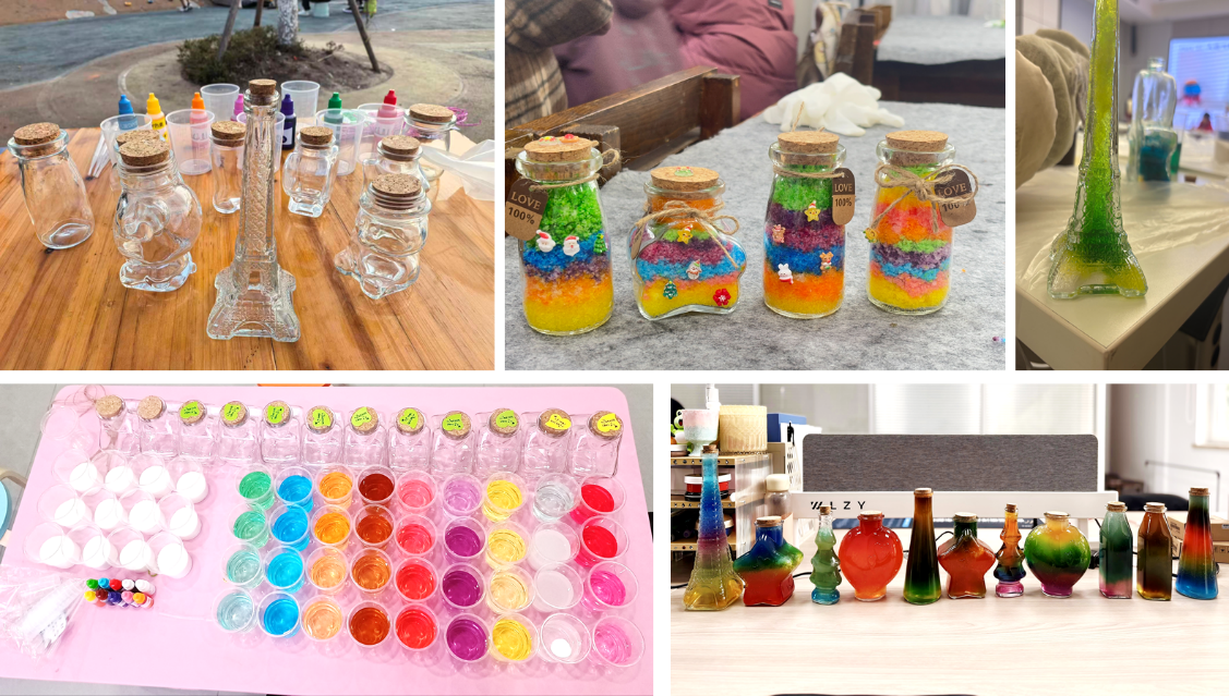 活动覆盖了浙江、江苏、河北、贵州、山东、四川、宁夏等全国7个省(自治区),从城区到乡村,从社区到幼儿园,200余名小朋友共同体验了化学的魅力。活动中,化学学院的学生志愿者化身“科学魔法师”,向各地的小朋友们普及了“人造雪” 的化学原理——高吸水性树脂遇水膨胀,并引导他们通过动手操作观察材料特性,带领小朋友们动手制作属于自己的“人造雪景观瓶”。活动不仅激发了孩子们对科学的好奇与兴趣,也帮助他们在实践中建立对化学学科的初步认知。