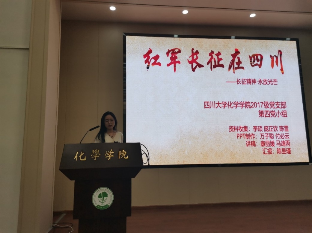 康丽媛组以红军长征在四川开展了精彩的宣讲,她们首先解读为什么红军长征纪念碑的建在四川的松潘县,松潘县是红军长征途中红一、四方面军会师的地方,在长征过程中在四川境内战役最多、会议最多、时间最久、四川在抗战中投入的人力物力决定了红军长征纪念碑的选址。她们还分享了长征中感人的故事如“金色的鱼钩”,通过这篇小学课文中的感人故事来引起同志们的共鸣,经过她们的宣讲,长征这一历史壮举以及长征精神更加鲜明地呈现在了大家眼前。其他组的同学分别就在党的领导下新中国成立以来取得的成就,毛主席著名文章“反对本本主义”等进行了宣讲。