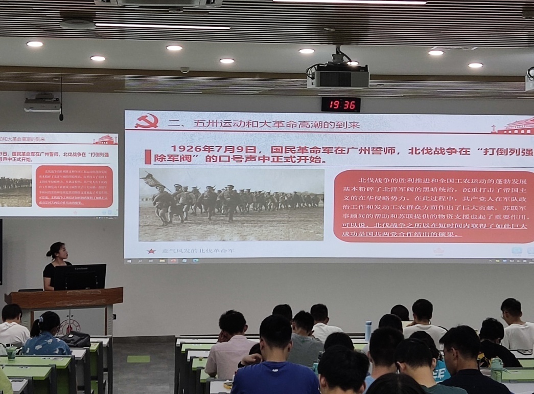 本次活动由宣讲团成员于晓艳同学主讲,以《开天辟地——中国共产党在新民主主义革命时期完成救国大业》为题,紧紧围绕新民主主义革命时期1919年五四运动-1949年新中国成立这一时间为线索,回顾这一段历史的主要事件,深入浅出的讲述了中国共产党在新民主主义革命时期完成的救国大业,并通过近代中国的历史经验阐明,没有中国共产党的坚强领导,就没有中国人民革命的胜利。随后,宣讲团成员陈亮同学分享了学习心得,中国新民主主义革命的胜利,结束了帝国主义、封建主义和官僚资本主义在中国的统治,建立了人民民主专政的新中国,青年们要深刻意识到:艰难困苦,玉汝于成,没有共产党就没有新中国!
