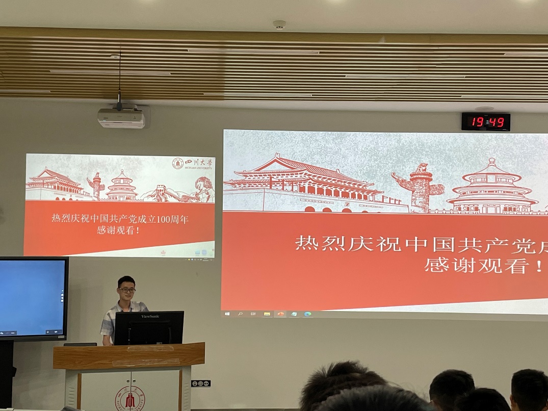 为庆祝中国共产党百年华诞,深入贯彻落实习近平总书记在党史学习教育动员大会上的讲话精神,让党史学习教育活动走进大学生课堂,四川大学2020-2021年“十九大精神宣讲团”化学学院分团于2021611日晚,在望江校区基C201教室开展了《学习百年党史,书写时代华章》庆祝中国共产党成立100周年学习宣讲活动。