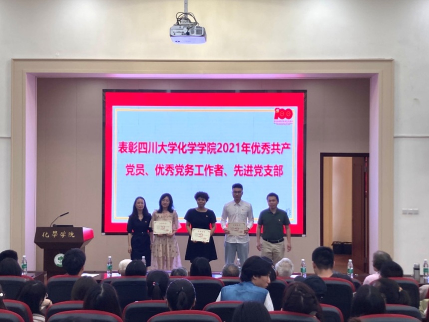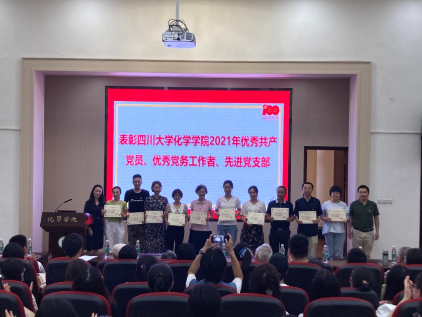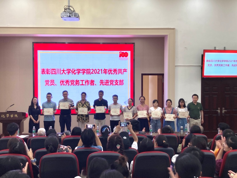 学院副院长郑成斌同志宣读了《关于表彰四川大学化学学院2021年优秀共产党员、优秀党务工作者、先进党支部的决定》,鼓励大家要再接再厉,继续奋斗。学院领导为获奖个人和集体颁发荣誉证书。