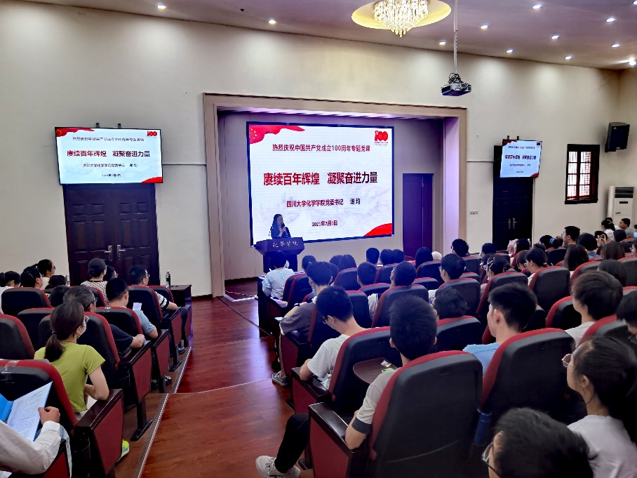 2021711500,四川大学化学学院庆祝建党100周年专题党课暨“七一”表彰大会在化学馆321报告厅隆重举行。学院党政领导、党委委员、纪委委员、专职组织员、支部书记及支委、民主党派代表、离退休党员代表、在职教师党员代表、学生党员代表及全体预备党员参加了本次大会。大会由院党委书记谢均同志主持,大会在齐唱《中华人民共和国国歌》声中拉开帷幕。