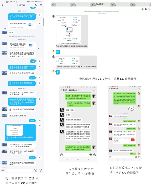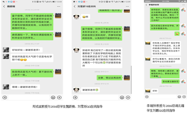 疫情期间,指导教师与学生间交流不断线,学院教学副院长郑成斌教授2月初已经与毕业班同学就本科毕业论文工作进行了交流,李瑞祥教授对身在湖北宜昌的刘鹏同学情况给予了关心和指导。老师们积极想办法突破现有局限,纷纷架起了“云组会”,陶国宏教授课题组2月26日上午召开了视频组会,学院院长游劲松教授于3月1日下午通过语音会议对本科生毕业论文进展情况逐一了解,并给与实时指导。指导教师们积极通过QQ、微信等方式与学生保持线上交流,鲜明案例不胜枚举,真正做到开学延期,学习不停息。